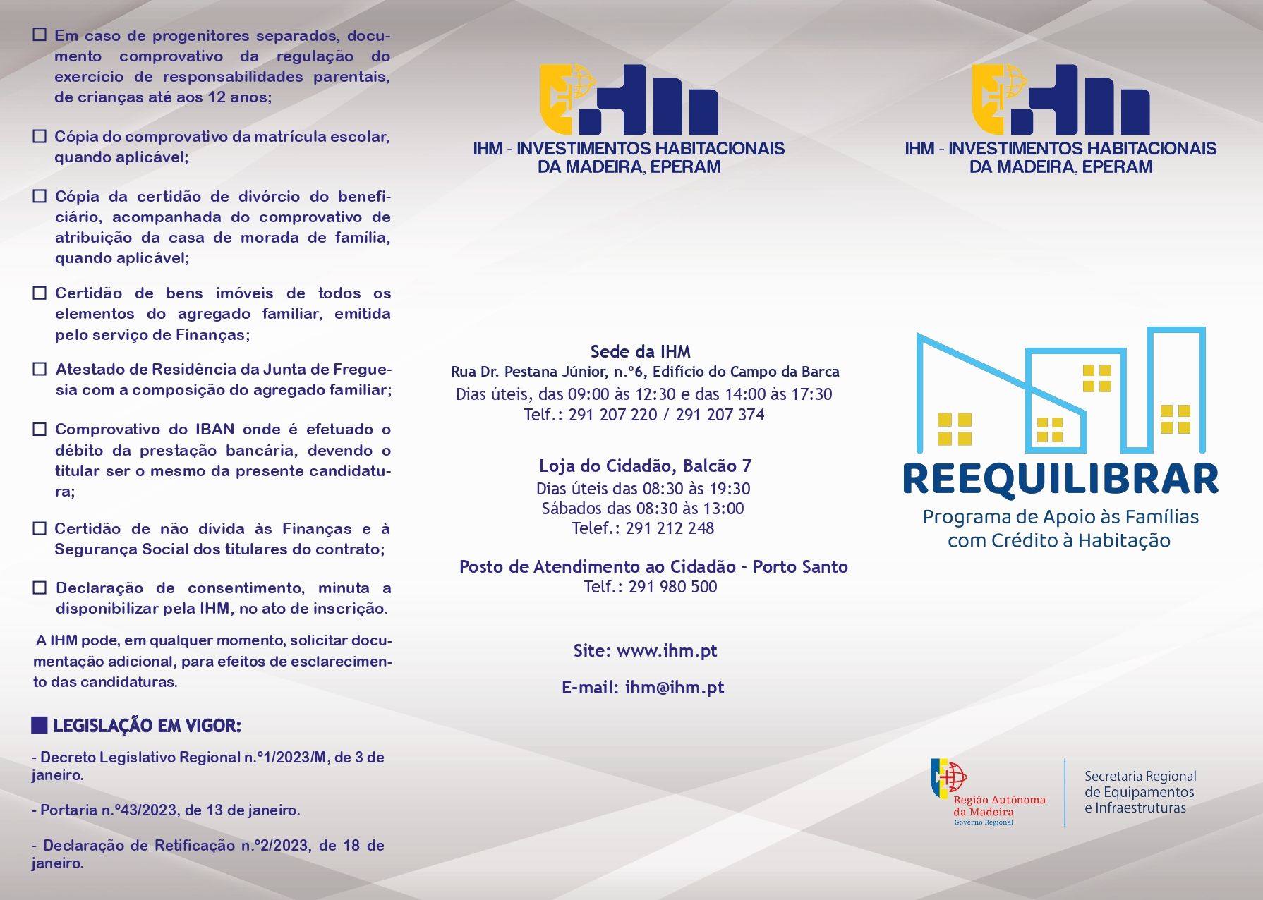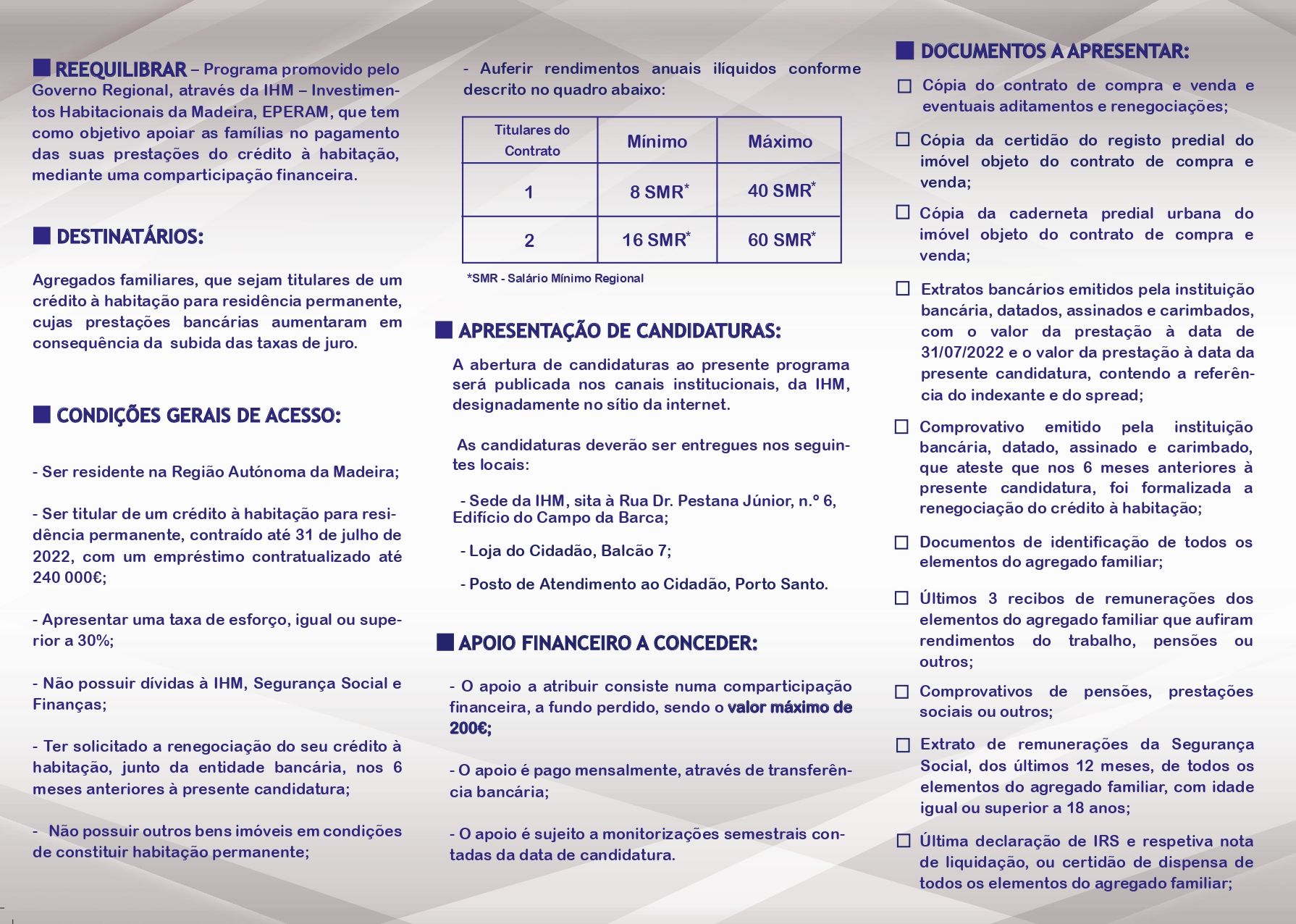 "O REEQUILIBRAR é um programa de apoio público, promovido pelo Governo Regional através da IHM – Investimentos Habitacionais da Madeira, EPERAM que tem como objetivo apoiar as famílias da Região Autónoma da Madeira (RAM) no pagamento das prestações do crédito à habitação para aquisição, construção, reabilitação ou beneficiação da sua residência própria permanente, em consequência do aumento das taxas de juro que se tem verificado nos últimos meses."